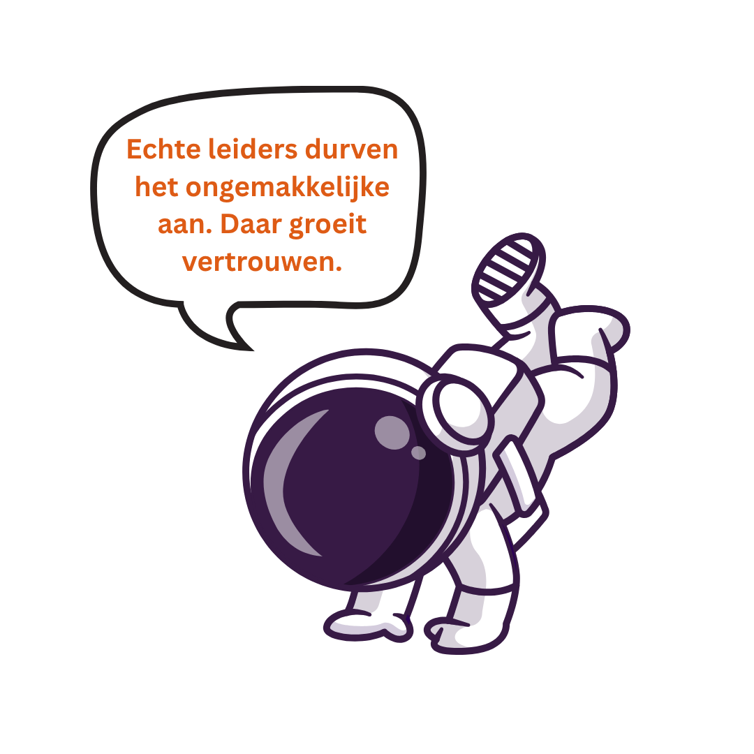 Een cartoontekening van een astronaut die een microfoon vasthoudt en zegt 'Echte leiders durven het ongemakkelijke aan. Daar groeit vertrouwen.'